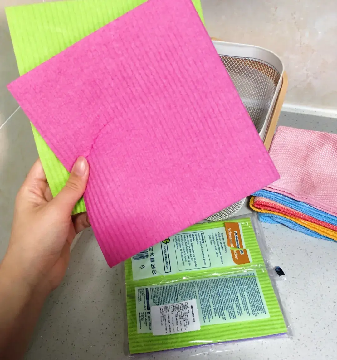 木浆棉抹布干的时候像纸,遇水就立刻柔软了,洗碗刷杯子都挺称手。