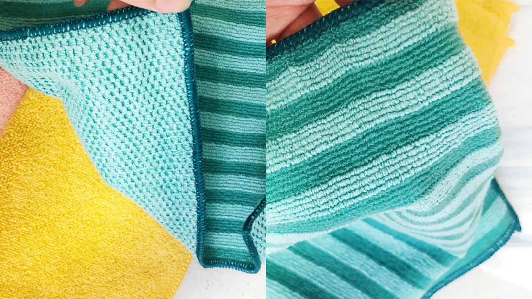 绿色这条就厉害了,两面是不同的织法,条纹深色的部分摸起来更硬,比普通超纤布的摩擦力更大,也就更易清洁顽固污渍。