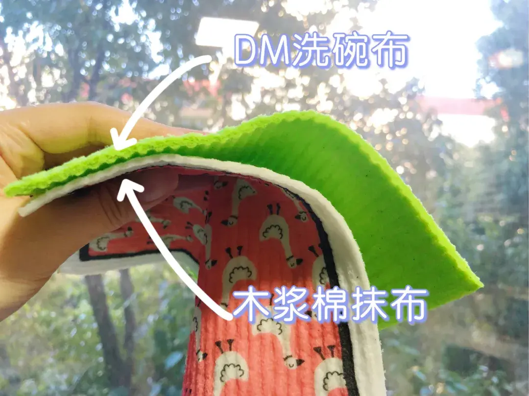 来给你们对比一下,DM洗碗布的厚度略微比木浆棉抹布厚一丢丢,在去油和清洁方面没有太大差别。