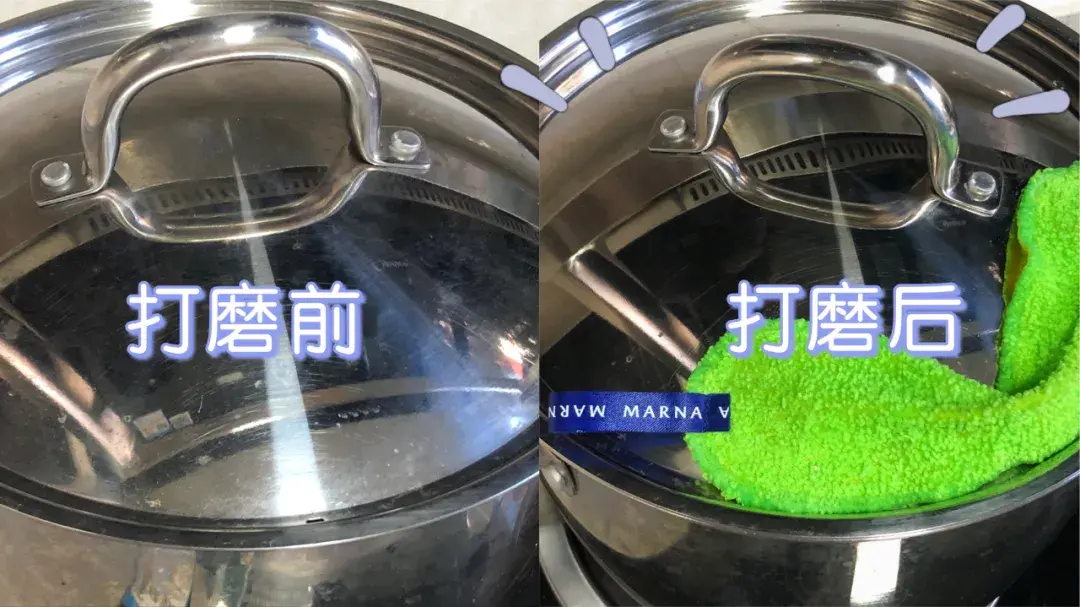 给你们看看我用它擦过的不锈钢锅具,没用清洁剂,差别还蛮大的: