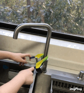 它是条状的中间还有褶皱,样子有点搞笑但特别好用。拉着两边的小耳朵就能轻松给水龙头“搓澡”了: